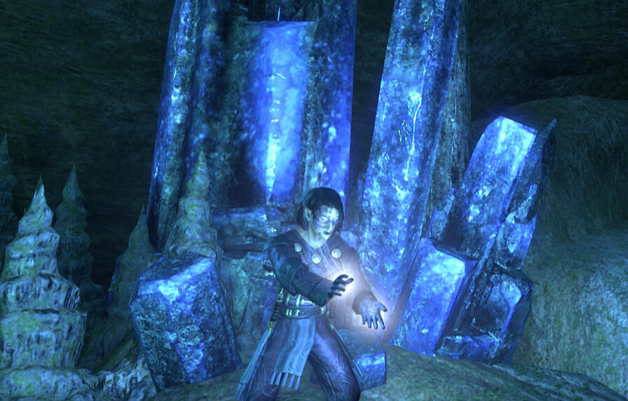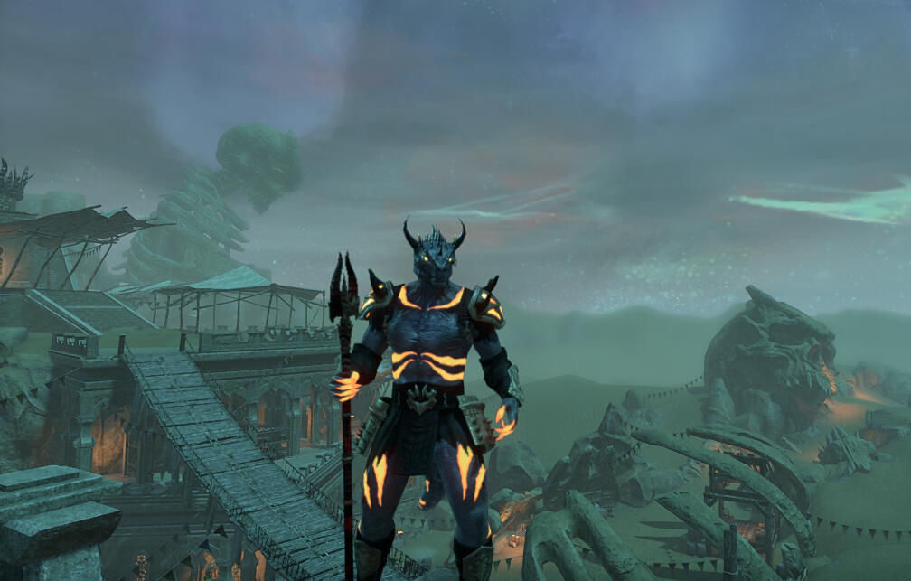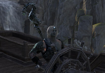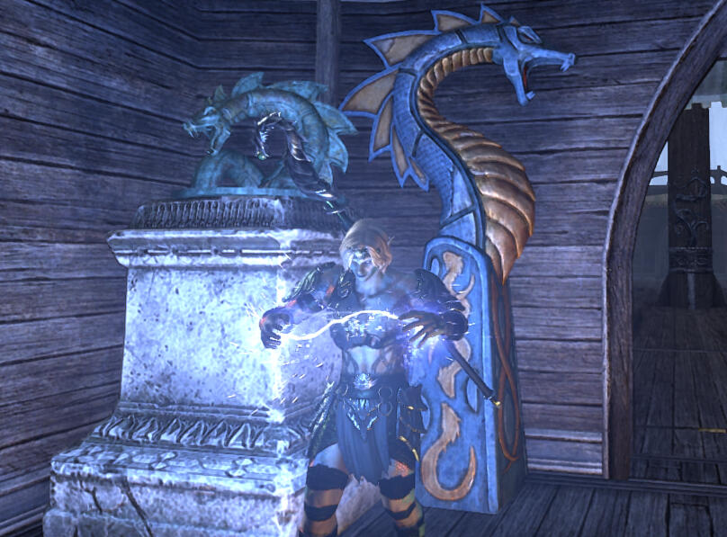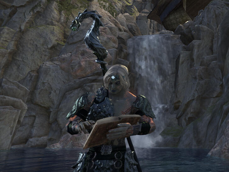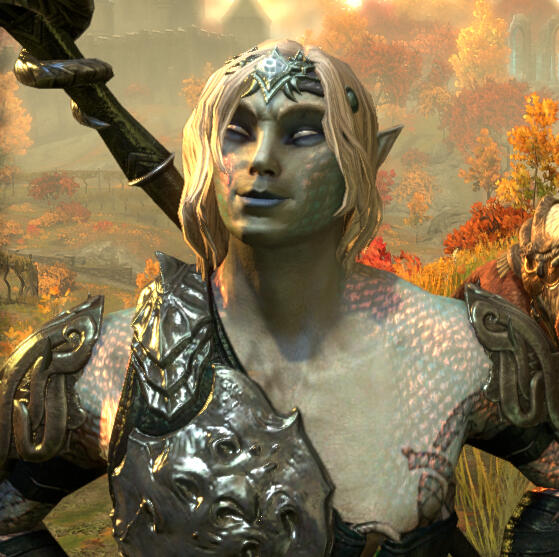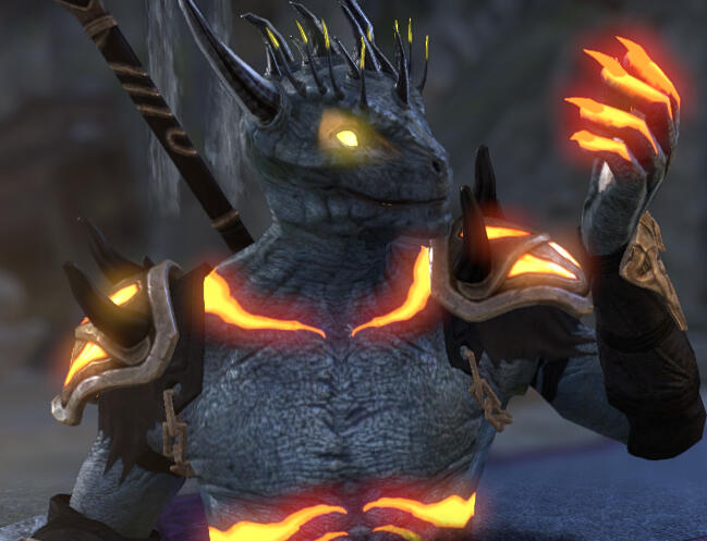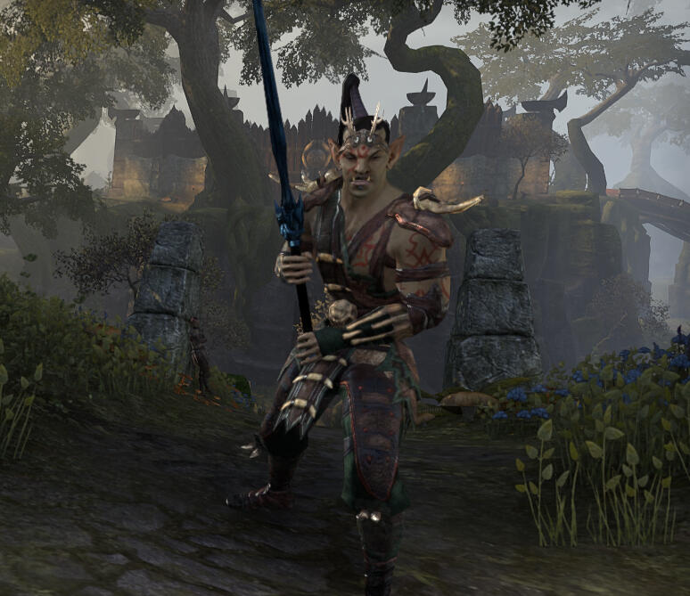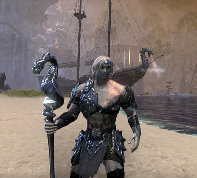 APPEARANCE: Kahrami is from an ethnically distinct group of Maormer, which is why he has more animalistic features. These include finned ears, sharp teeth, a slightly forked tongue, and iridescent scaled skin. Although his scales offer durability and protection, his body has a soft, almost squishy quality. He has ivory hair, blue lips, and pale white eyes. His body is lined with tattoos of snakes, which glow when he casts spells. Kahrami boasts enchanted Pyandonean armor and a mystically attuned staff, which allow him to engage with weather magic on an even more powerful level.VOICE: Male Dark Elf Voice E