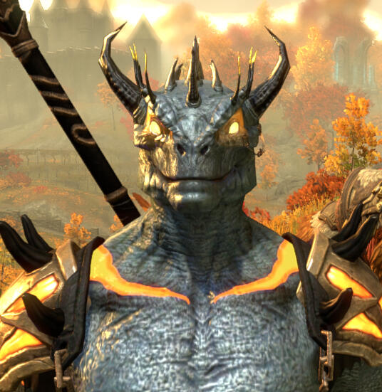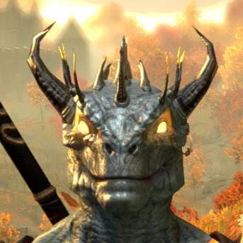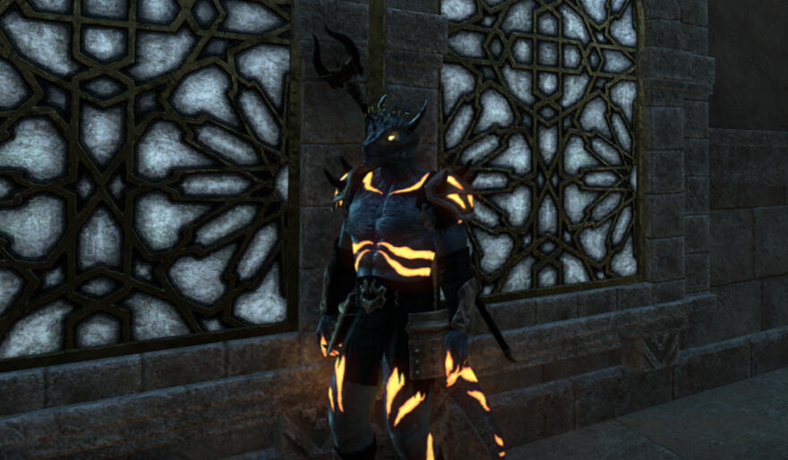 APPEARANCE: Standing taller than the average Argonian, Levi is built with broad shoulders and a chiseled muscular physique. The first thing people tend to notice about him would be the glowing markings lining his body, emanating a honey gold from his eyes to his claws. Among the spikes on his head are a large pair of curved horns, alight with magic much like the rest of his body. Upon closer inspection, one might also take note of the dangling chain piercing on his cheekbone. He wears simplistic armor, with subtle Dremora themes hinting at his hidden Kynaz nature, and another set of chains hanging from his arms to indicate his mandatory devotion to Sanguine.VOICE: Male Argonian Voice C (but slightly more baritone)
