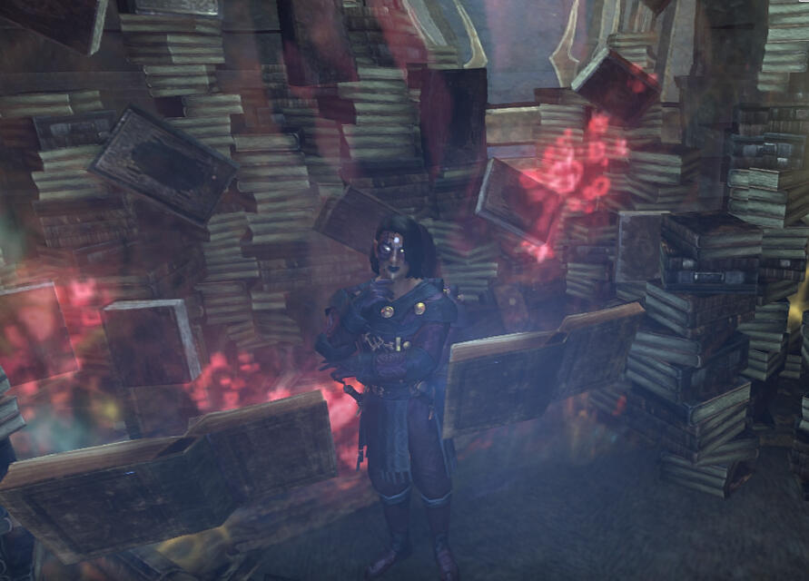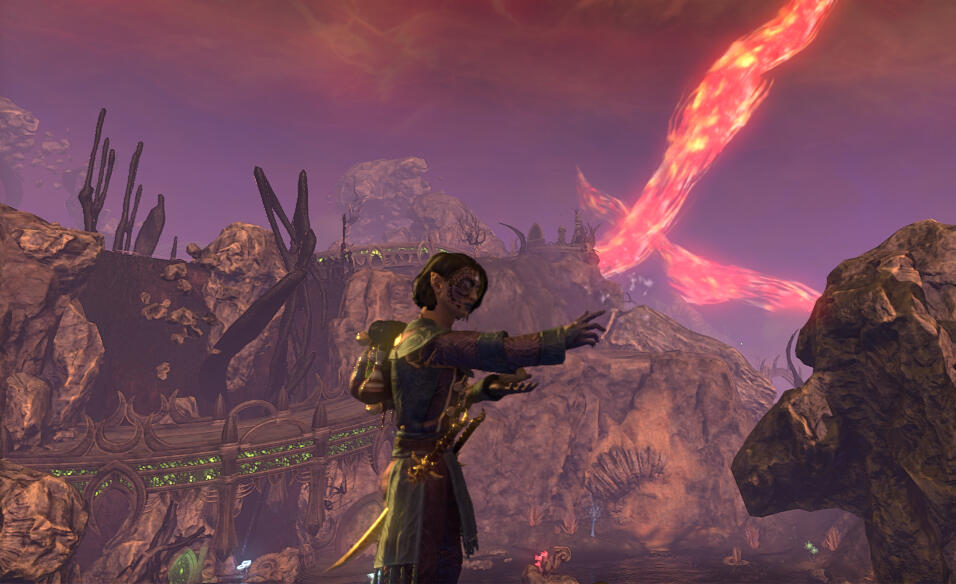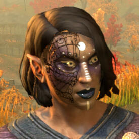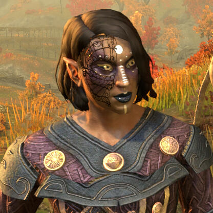 APPEARANCE: With a visage clearly marked by intense magical usage, Erez stands out for his glowing yellow eyes, gold and amethyst tattoos, and the intricate metal lace mask that lines the right half of his face. His irises spark with light when he casts spells or when his interest is piqued. Erez is a petite man; short even for a Bosmer, with a thin yet toned frame. He wears his dark hair at chin-length, often tucked behind one ear so that he can see properly. His outfit comprised of thick, expensive fabric with ornate gold laden throughout.VOICE: Male Wood Elf Voice C