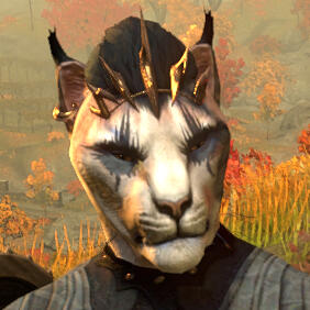 APPEARANCE: With an unimposing height and wiry musculature, Sheqer's figure does not strike many as intimidating. He has calico patterns on his otherwise white fur, and dark gothic markings around his eyes that match his wild jet-black hair and ear tufts. One of his most distinguishing features are his saber cat teeth, which appear almost vampiric (although he lacks the curse). He wears dark clothing to aid his subterfuge; although it is not durable, it allows for great flexibility. He retains the mark of the Dark Brotherhood on his chest, perhaps ironically. When unmasked, he brandishes a sharp golden crown, no doubt stolen during his exploits.VOICE: Male Khajiit Voice E