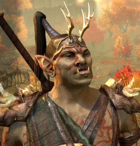 HISTORY: Solgun was born into the Drublog Clan of Malabal Tor. As a trans man, his strength was naturally underestimated; but he proved himself time and time again as a formidable warrior and an asset to the tribes, thanks to his enviable weaponsmith skills. With the help of a shaman, he transitioned to the man he is today. In his early adult years, he inherited a bear cub from one of the tribe elders, entrusted with the young ursauk as a powerful ally. He named her Deathbreath.At some point, he came across a Bosmer skulking through the forest and confronted him, under the impression that he was sneaking towards the nearby Orc community. The Wood Elf turned out to be a member of the Houndsmen, and put up a surprisingly impressive fight, resulting in a mutual respect between the two men. They became regular sparring partners - and more - but one day, the Bosmer's feral instincts overtook him and he ended up biting Solgun, turning the Wood Orc into a werewolf. Solgun claims he killed the Wood Elf for this transgression, but that is one of his rare lies. Having been tethered to Hircine, Solgun was banished from his tribe, leaving him lost.It was at Velyn Harbor that he met Kahrami, a Maormer who too had been exiled from his people. The peculiar Sea Elf invited him to join his crew of misfits, the Silver Lining Traders, who travel across Tamriel for their work. This introduced him to a new purpose: adventuring in unfamiliar lands and sharing the weapons he constructed. It was through the Silver Lining that he found his welwa, Troublemaker, and his mountain bear, Maskrump.