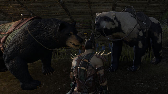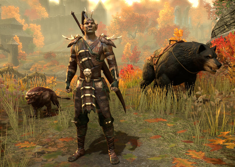 PRESENT DAY: Solgun spends his days traveling with the Silver Lining Traders, crafting high quality weapons to sell, and taking on arborist jobs in various locations where tree maintenance is necessary. His evenings are filled with social drinking and secretly hunting by moonlight in lycan form.He has three animal allies who often accompany him on his journeys. Deathbreath and Maskrump, his two bears, and Troublemaker, his juvenile welwa.Although he explores frequently, and is no longer welcome among the Drublog Clan, his home is still Malabal Tor. He lives in a small house that is hidden in thickly overgrown foliage. The level of tree density around his house is surprising for an arborist, but it is fully intentional, as he values his privacy and does not appreciate unwanted visitors.