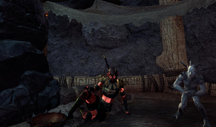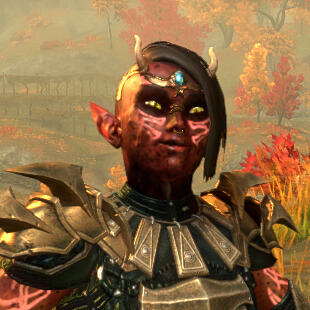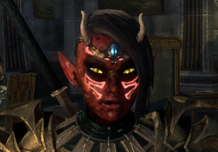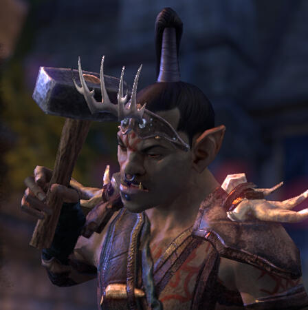 APPEARANCE: While his appearance looks remarkably similar to a Havocrel, Araqiba has merely two arms and is far too short to resemble the enormous Daedra. With a slender yet curved physique, he has little muscle to boast about, in spite of his claims. His hair is charcoal black, contrasting with his ivory horns. He has glowing golden eyes and markings that line his body, which is almost always covered in a mixture of dirt and soot. Occasionally, he shapeshifts to add a pair of intimidating wings and a long tail to his arsenal.VOICE: Female Wood Elf Voice C (but deeper and more masculine)