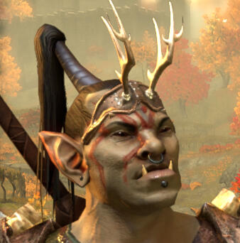 APPEARANCE: Solgun is of typical stature for a Wood Orc, but he is lean by the standards of other Orcs. He sports long black hair worn in a ponytail, and an antler adorned headband which hides small horns beneath. His nose, bottom lip, and right ear have piercings. His face and body brandish blood red tattoos originally given to him during his Drublog days, matching his deep crimson eyes. He wears tough yet soft leather armor that allows for agility and swiftness. Solgun is never found without a finely crafted sword or two, which are always self-made. He has a prominent bite scar on the back of his right thigh. As a werewolf, he has charcoal and pale gray fur, with golden eyes. His physique is notably larger and more muscular than his Orc form.VOICE: Male Orc Voice F (deeper and more guttural in werewolf form)