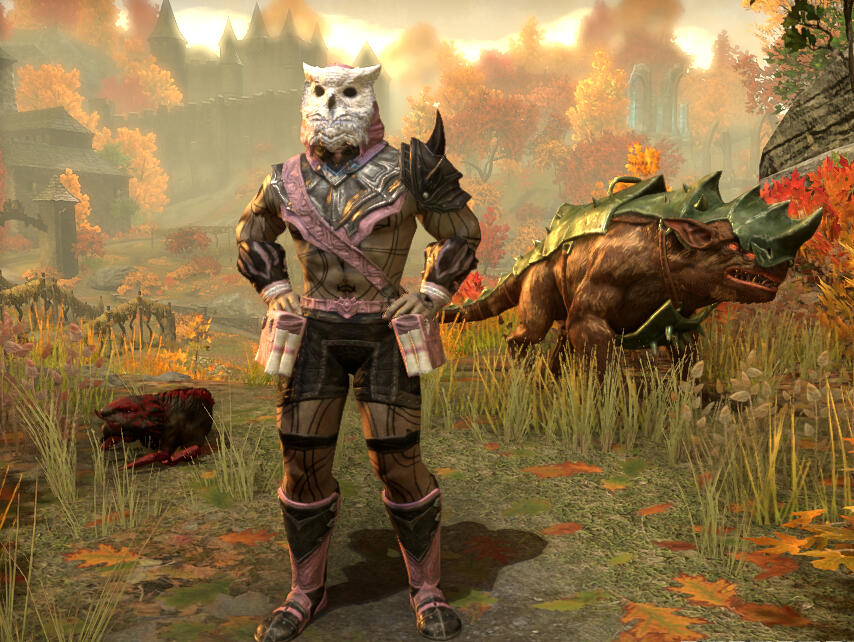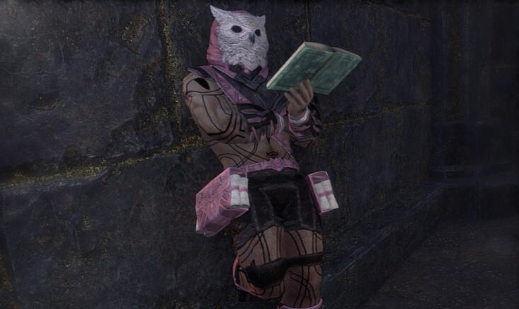 APPEARANCE: Standing at a height that towers above most, Kubsa displays a powerful muscular physique with broad shoulders and thick chiseled arms and legs. Hiding behind his signature owl mask is a pleasant smile, thick ebony and red hair, and glowing crimson eyes to match. He has mystic tattoos lining his body that depict large, watching eyes. He prioritizes comfort with minimal pink and black armor that is enchanted to offer him a layer of magical shielding.VOICE: Male Orc Voice C
