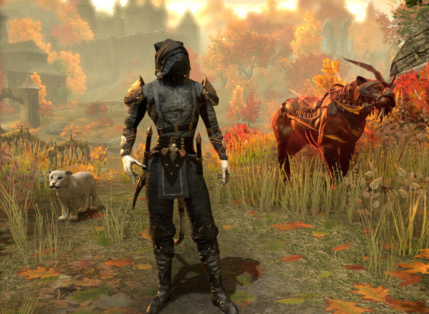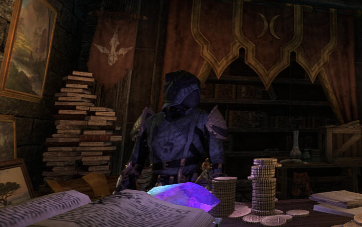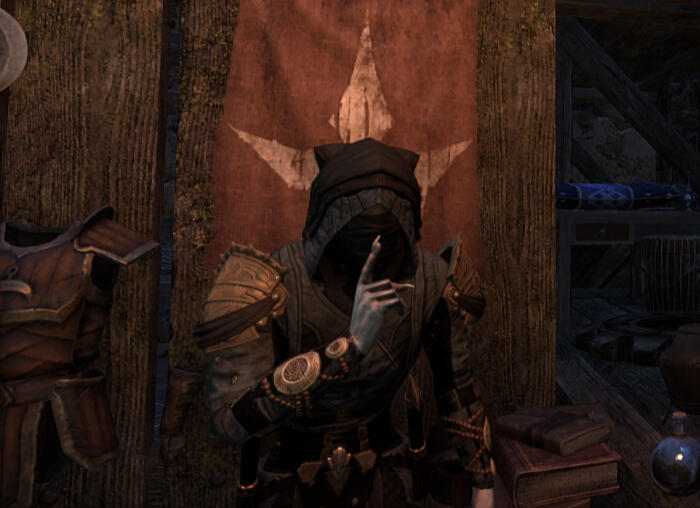 PRESENT DAY: Most of Sheqer's time is spent fulfilling mercenary jobs as a career criminal, confronting enemies who have tracked him down, and keeping his distance from the Dark Brotherhood. He is a former member who is being hunted by them for betraying the guild, but he still has connections in the assassin industry. As evidence of his hubris, he demonstrates very little caution at times by showing himself in public settings, almost as if he's inviting danger.Sheqer has few close allies, but he is accompanied by two Saber Cats; Aura, his mount, and Crescent, her adoptive cub.Being a nomad, Sheqer has no official home, but he has various hiding spots throughout Tamriel.