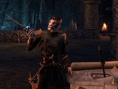 HISTORY: There is not much Sheqer is willing to divulge about his past. He admits to not having grown up in Elsweyr, but refuses to elaborate on where he was raised. However, it is no secret that he spent his early adult life making a name for himself in the Dark Brotherhood and the Thieves Guild. Throughout this time he committed countless crimes, all within the realm of theft and murder, and made many enemies who still hunt him to this day.Despite his allegiance to the Dark Brotherhood, he never cared much for their politics, becoming known as a fringe assassin who only got involved in jobs for his own benefit. This was fine with the Brotherhood until another organization offered to pay Sheqer to betray them by killing one of his fellow Brothers. He obliged in exchange for a hefty fee, but as a result of his treachery, became enemies with his own guild. As if amused by the inherent danger that follows him, he's never seemed terribly concerned with his own safety.